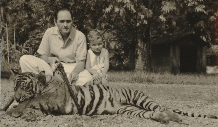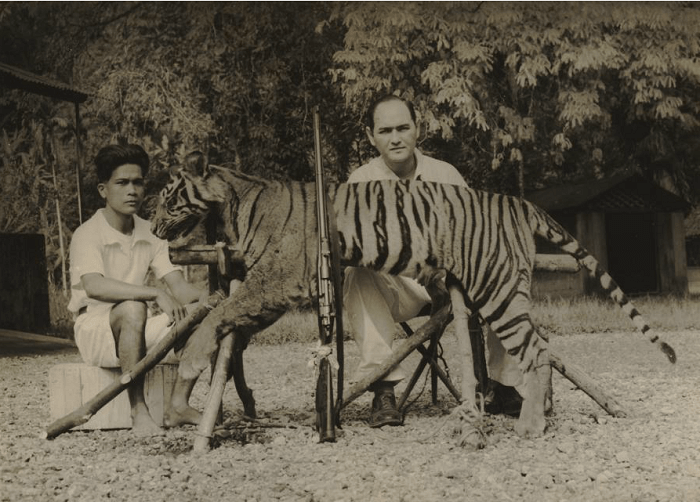 E.G.A. Lapré (Controleur di Painan) dan anaknya Freddy bersama seekor harimau yang telah mati. Harimau tersebut ditembak di kawasan Tambang di Painan. Foto tertanggal 18-11-1937. (Foto : kitlv.nl)